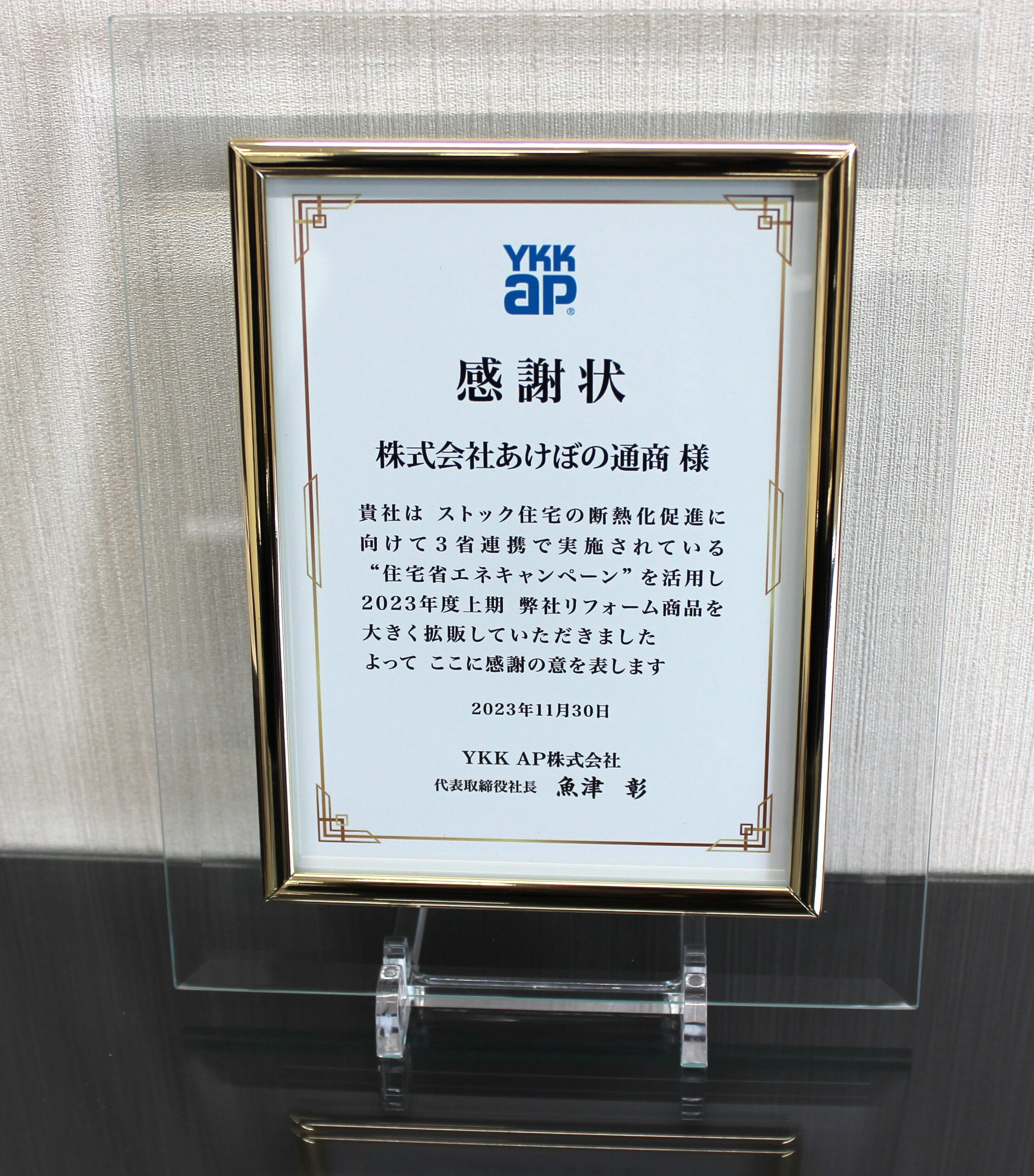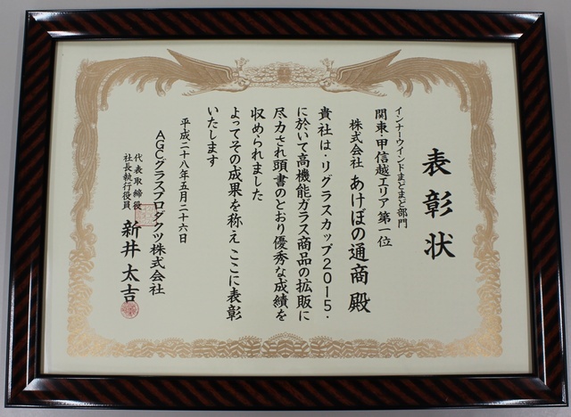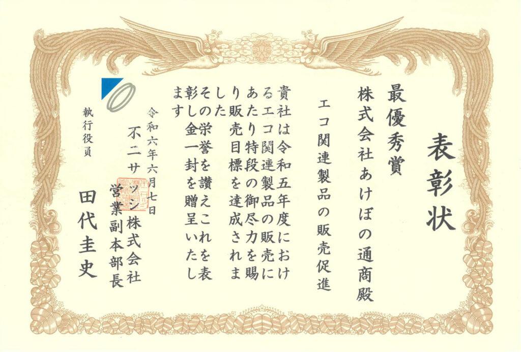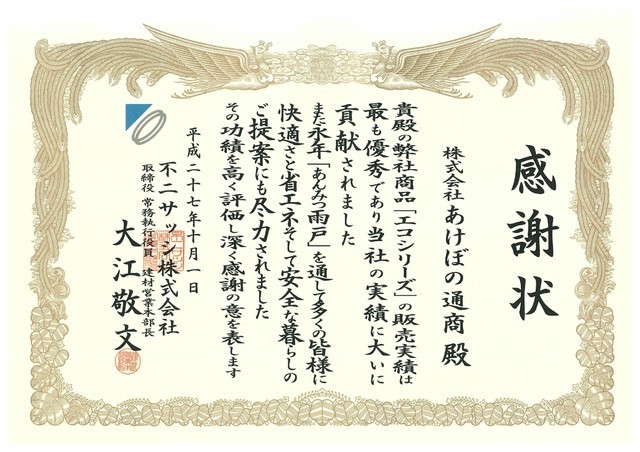 2015年10月、不二サッシ様より「エコシリーズ」(あんみつシリーズ)の普及に貢献した感謝状を頂きました。