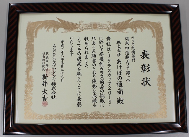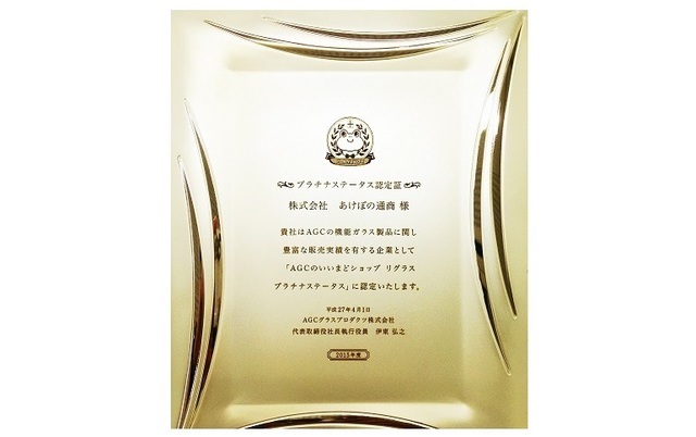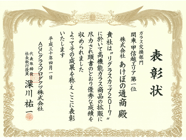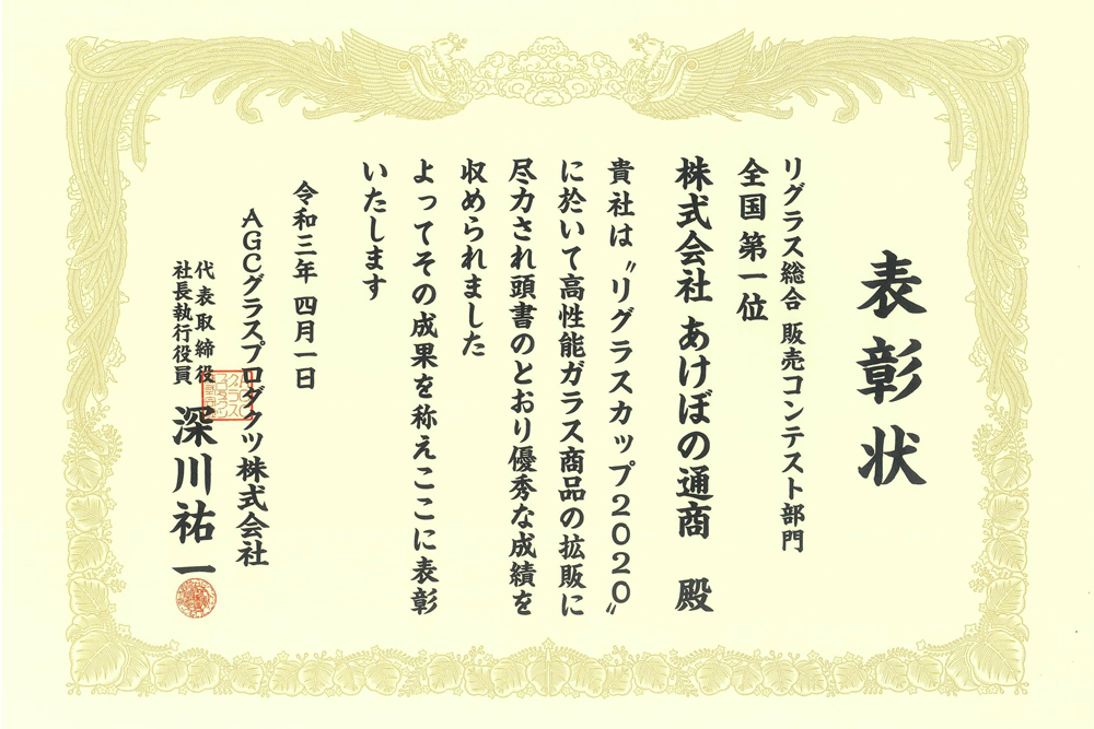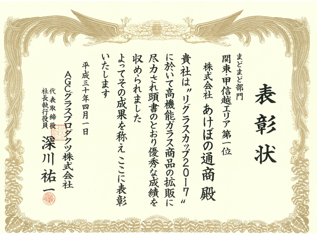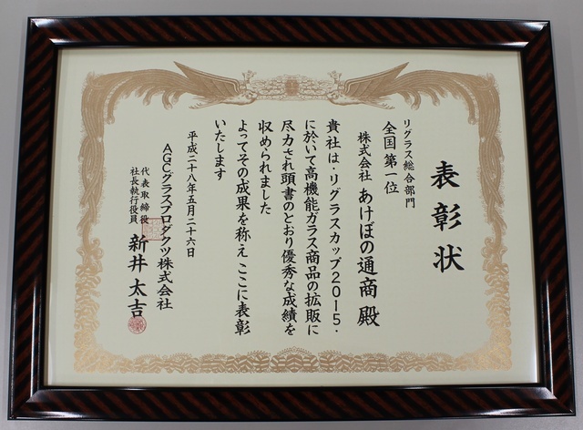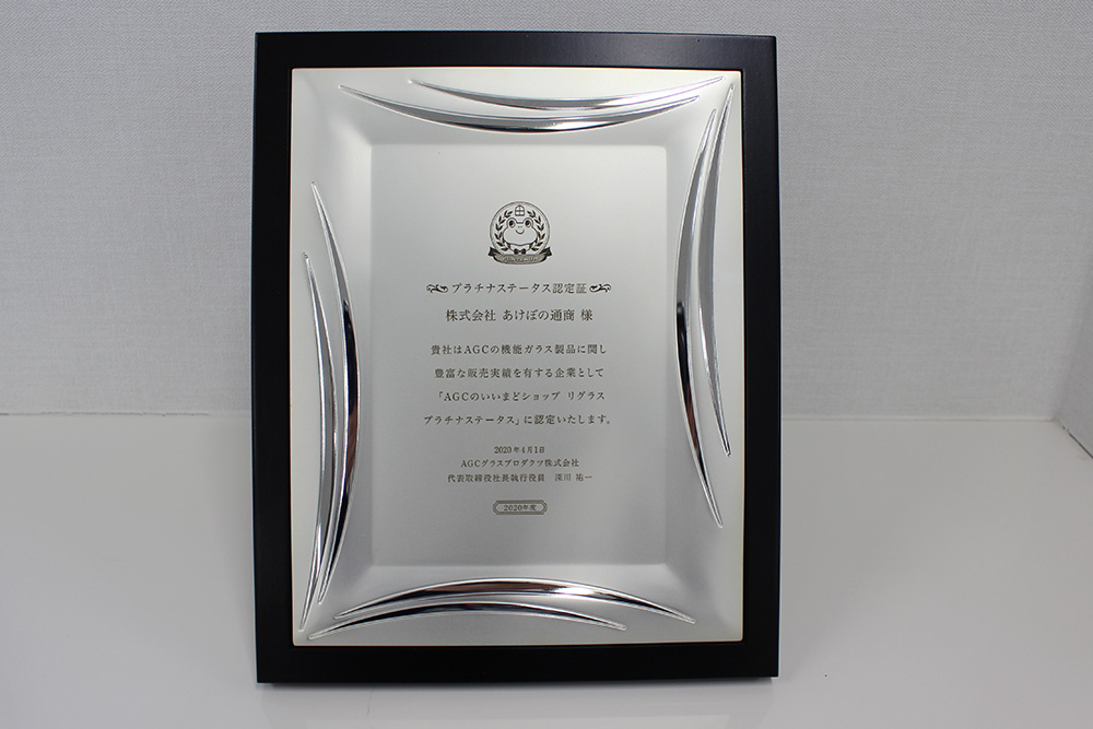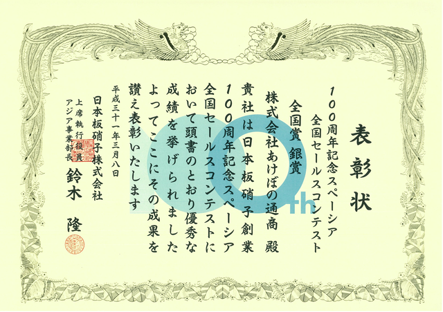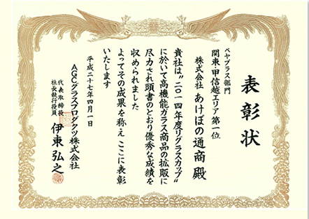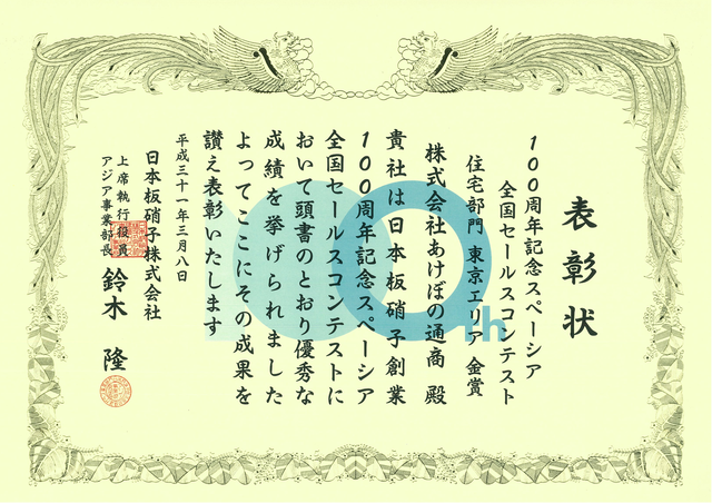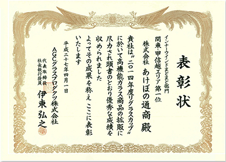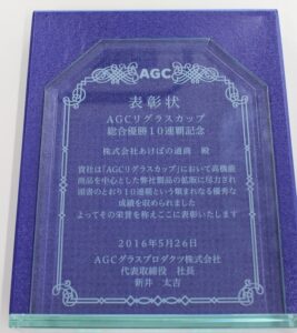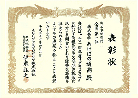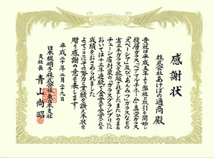 当社は日本板硝子㈱様主催「ガラスグランプリ」(現在は廃止になっています)におきまして13年連続で「金賞(第一位)」の成績を残すことができました。