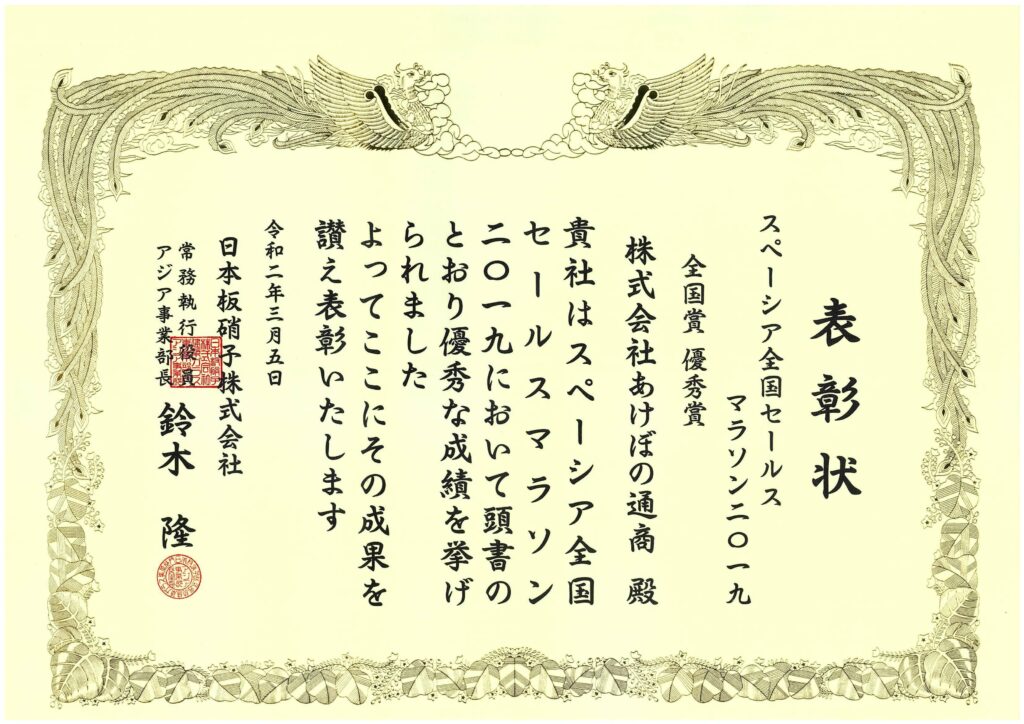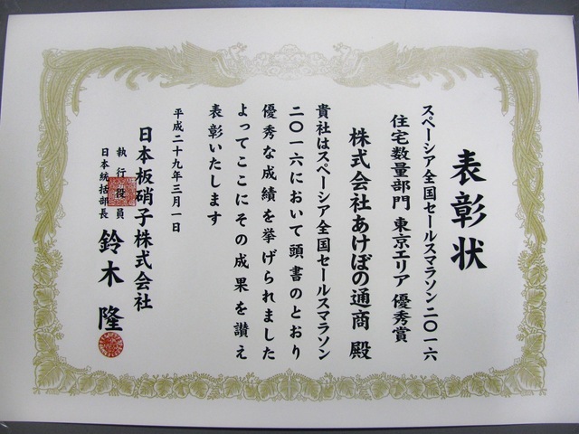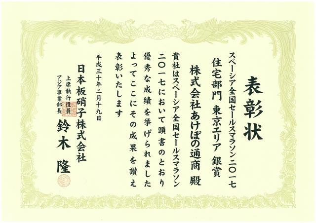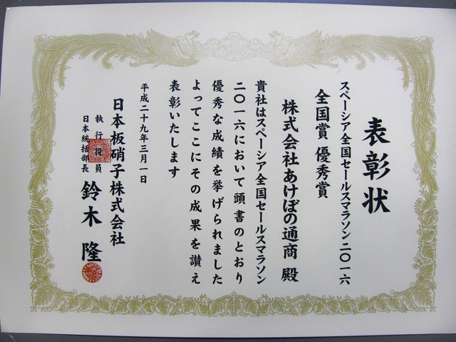 2016年3月、日本板硝子様”2016年度ひのまるチェーン東京支部定例総会”にて、スペーシア全国セールスマラソン2015「全国賞 銀賞」を頂きました。