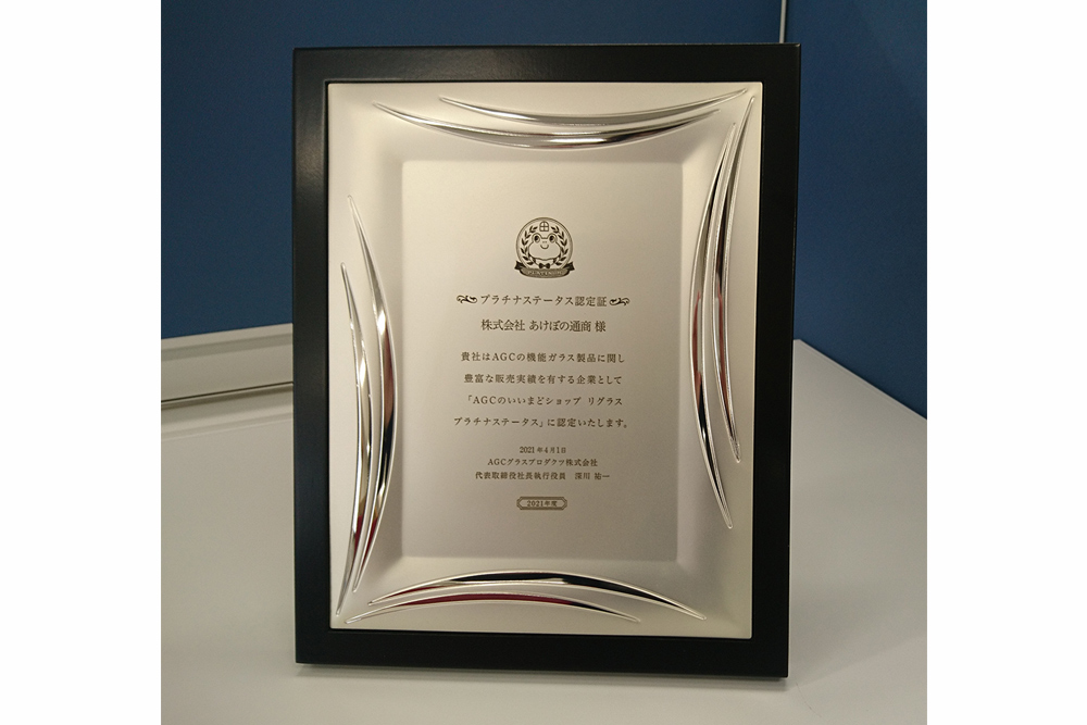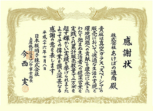 2014年7月にも真空ガラス「スペーシア」累計販売数量20,000㎡超を記念して感謝状を頂きました