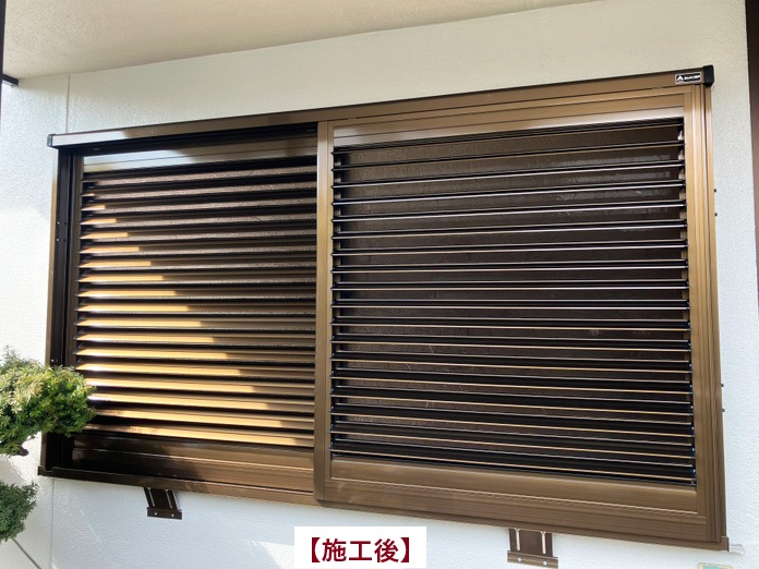 元々雨戸が設置されていなかった窓にも、後付けで『あんみつ雨戸』を取り付け可能です。近年大型化する台風や突風への備えとして、窓ガラスの破損不安を解消。設置後は「これで安心です。」とのお言葉をいただきました。