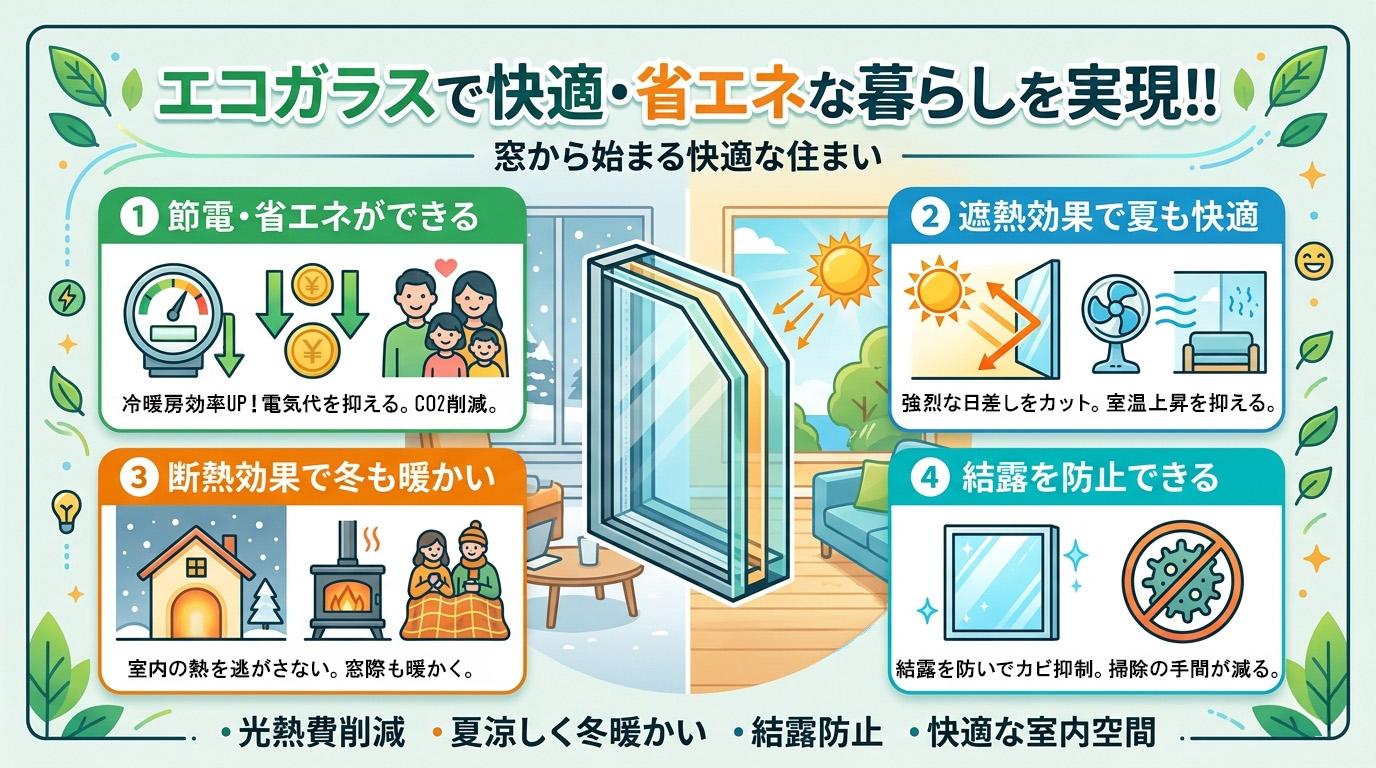 といったように、1年を通して快適な暮らしを実現してくれます。窓は住宅の中でも最も影響力の大きい部分です。だからこそ、窓を変えるだけで住まいの性能は大きく変わります。「夏暑い」「冬寒い」「結露がひどい」といったお悩みをお持ちの方は、ぜひエコガラスの導入を検討してみてはいかがでしょうか。毎日の暮らしが、より快適で経済的なものへと変わるはずです。