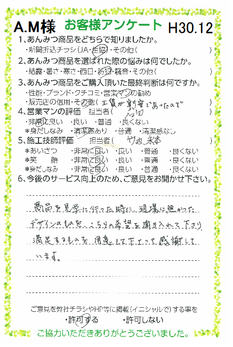 展示相談会に足を運んでくださり、ありがとうございました。ご提案させていただいた商品をご満足いただけて嬉しく思います。また、何かございましたらお気軽にご連絡ください。ありがとうございました。(岩田)